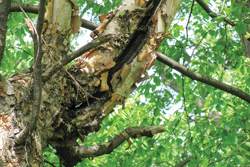 Extensive decay/sunscald. Flaking and peeling bark on the south, west or southwest side of a tree in the first 10 years of a tree’s life often leads to a serious lack of water conductivity and, thus, significant stress. In these situations, a removal or retention decision needs to be made before the problem enlarges and causes further reduction in the movement of water.