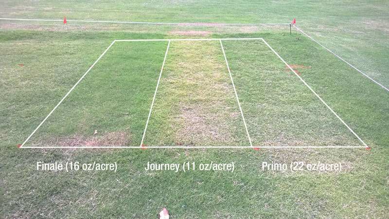 Figure 1. Distinct phytotoxicity symptoms are seen in bermudagrass rough one week after initial application of Finale at 16 ounces/acre; plots treated with Journey and Primo do not show phytotoxicity. Photos by Philip Brown