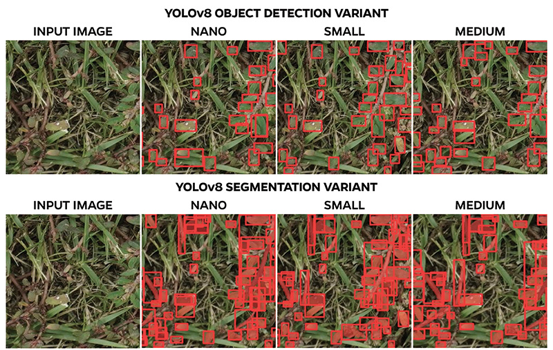 The study utilized YOLOv8, the latest model version at the time, to train separate object detection and segmentation models using nano, small and medium variants (Figure 1). All variants were trained on the same dataset with appropriate labeling and default hyperparameters, including 100 epochs, a batch size of 16 images and a resolution of 544 pixels. While hyperparameter fine-tuning can optimize performance, this research focused on comparing weed-recognition models under limited training data, not developing a market-ready product.