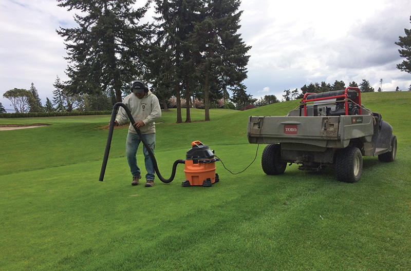 This photo dates to 2017, and I find it quite a good example of how to be creative and fix problems as they arise. One of the employees on this course used the wrong grass seed in the divot mix on all of the tees. The turf on the tees and fairways are roughly 95% Poa Annua and 5% bentgrass/fescue, and the divot mix the crew uses is Chewings fescue. The superintendent had used a herbicide in the few years prior to this incident to eradicate the ryegrass and bentgrass. Because the areas were 95% Poa annua, he felt those other species looked out of place. Chewings fescue was identified as a nice fill-in grass to Poa annua, in terms of color and growth rate, and the Poa annua chokes it out more easily over time as compared to rye or bentgrass. Unfortunately, the employee used ryegrass in the divot mix by mistake, even though it was kept in a separate area under lock and key. The superintendent didn’t know how to prevent growing the undesired grass on all of the tees. He glanced out of his office and saw the shop vac in the corner and got a great idea. He went home and got his personal generator from his garage, and, voilà, he had the solution. He had the employee shop vac all the sand and seed from the divots he had just filled hours earlier, and it worked perfectly — and it turned out to be a good lesson for the employee.