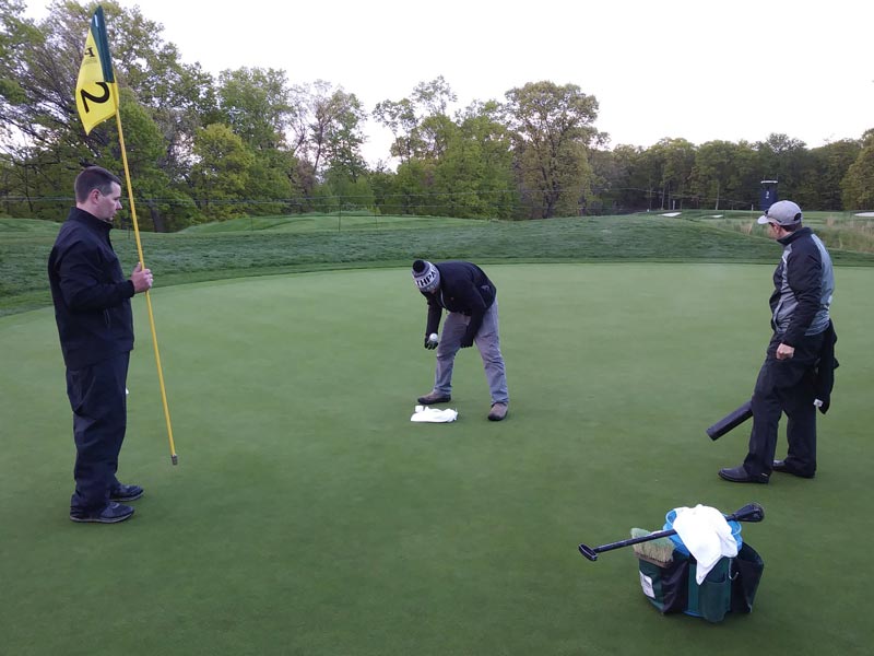 Crew and volunteers head out for day two of preparations, focusing on rolling greens and dealing with wet areas after rain: