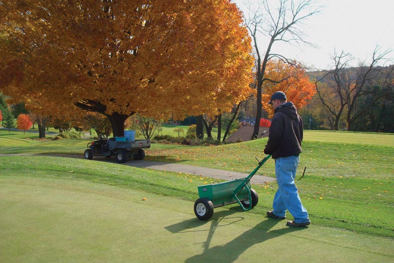 Use a drop spreader with granular fertilizer so that more nutrients will be taken up by the roots and by the crowns, which form the key carbohydrate storage organ. Use a natural organic fertilizer that contains no urea or other sources of water-soluble nitrogen that may cause burn in summer.