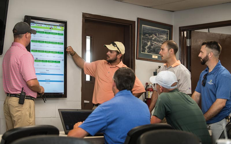 VanBuskirk (far right) developed Turf Cloud along with his partner, Stephen Ohlson, as a tool to help superintendents manage a property’s relevant data. Here, he reviews the product with superintendent Matt Powell (standing, second from right) and his team at Dedham (Mass.) Country and Polo Club. Photo by Rick Bern