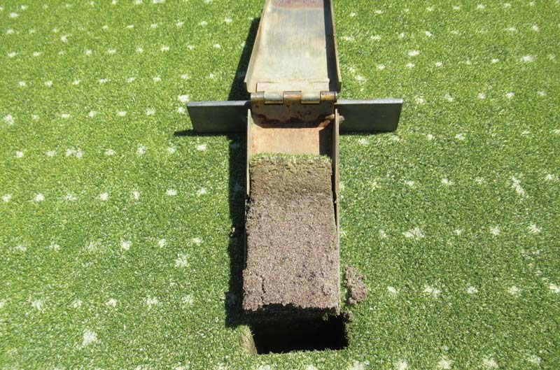 Making that aerification hole — whether through solid tining or by removing a plug of soil/thatch/turf — incurs the risk of heaving the turf, meaning the roots separate from the soil. This is especially problematic in late summer, when root systems are weak. A heaved turf will take a few weeks to re-root and, in the meantime, will require more water, making the surface softer than it was before aerification.
