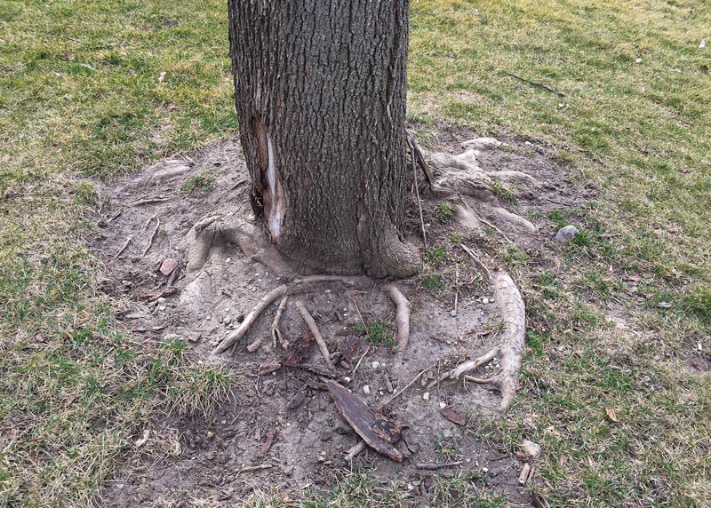 Under ideal circumstances, roots develop in an arrangement like spokes on a bicycle wheel. Sometimes, however, one or more of them encircles the trunk, creating included bark, which may limit translocation of nutrients sufficiently to cause tree decline.