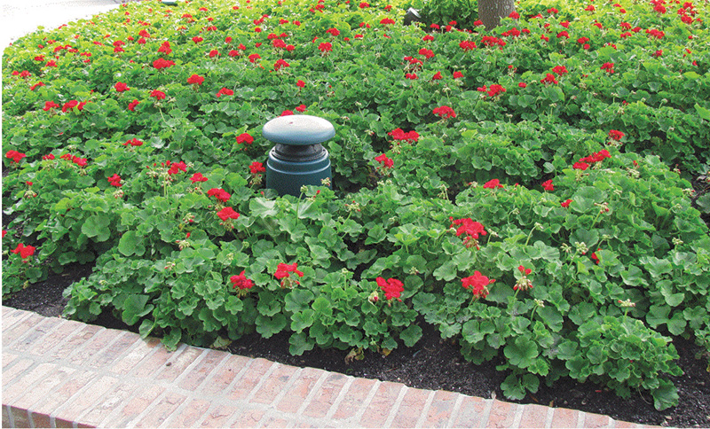 with wider spacing to allow for better access. These types of settings should be free of plants with thorns, tangled vines or rough leaves; maintenance technicians injured while servicing these features aren’t likely to be happy with the designer