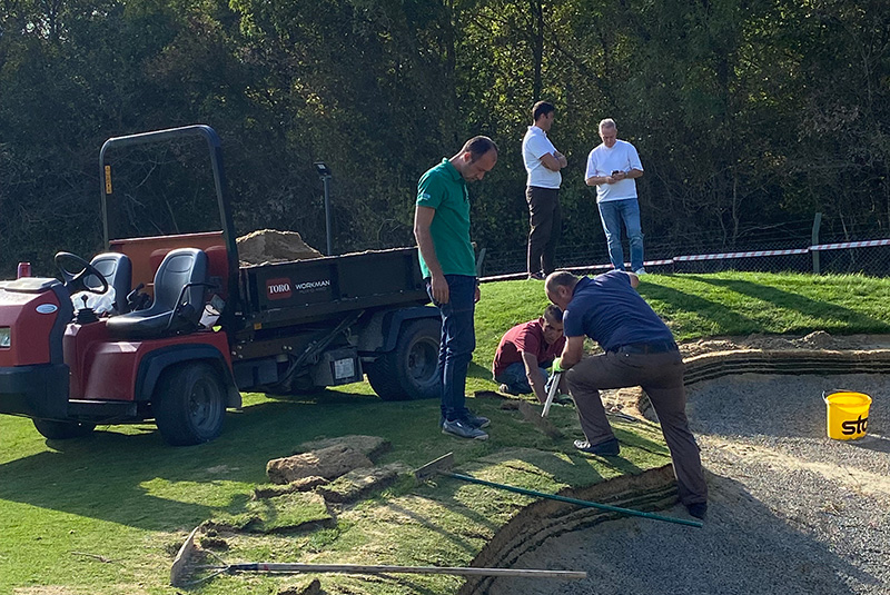 The greens were overseeded with Poa trivialis “Quasar” and the tees, fairways, and primary roughs with Lolium perenne “Sun.” They were constructed on 12 inches (30cm) of sand. All the sand used on the project was thoroughly analysed at European Turfgrass Laboratories to compare them against USGA recommendations before approval. No amendments were incorporated into the root zone, but zeolite, organic fertilizer and starter fertilizers were applied to the surface prior to planting.