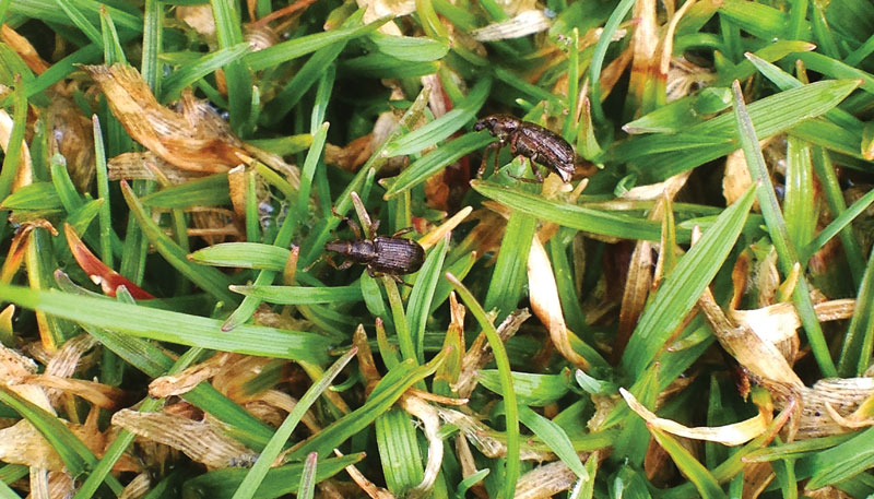 Because annual bluegrass weevil is a recurring pest and has for years been exposed to multiple high-rate insecticide applications in the Mid-Atlantic region, insecticide resistance has become a problem in the area. Photo courtesy of Sam Camuso