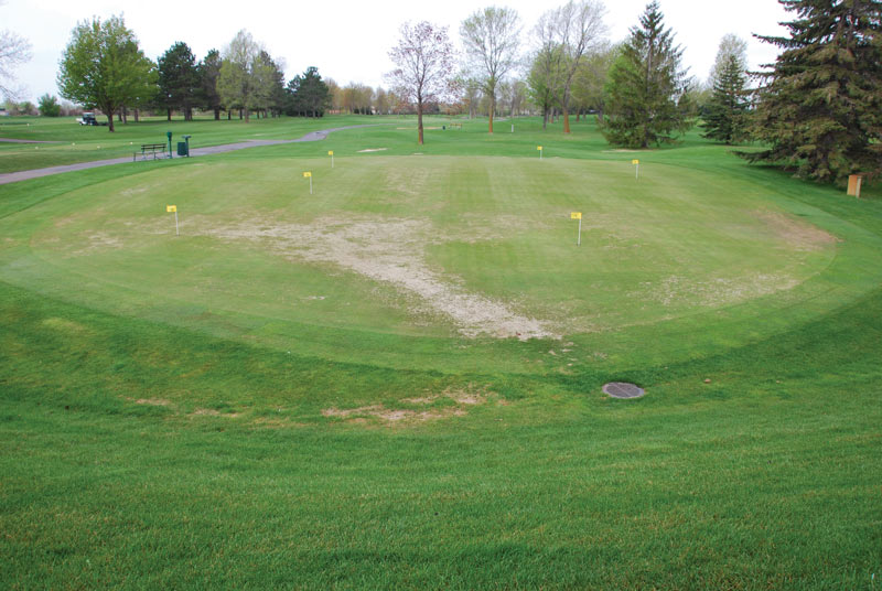 This green was injured under an impermeable cover with no insulating layer. The low area where water sits is not injured, but the center of the green is severely damaged, probably by anoxia or crown hydration. Photo by Andrew Larsen