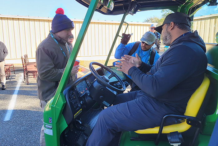 The 50 superintendents on the tour were led into the maintenance shop’s break room for a series of slide presentations. The first was on irrigation auditing by Matteo Serena, senior manager of Irrigation Research and Services, USGA Green Section, and 15-year GCSAA member.