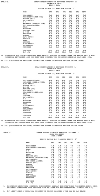 The NTEP’s Turfgrass Trial Explorer features a customizable, user-friendly interface that makes comparing turfgrasses easier than the NTEP website’s approach. Shown are the results of density for three seasons of trials for bentgrass (greens) from 2015-19 in Georgia. The click-sortable table below has top performers shaded in green.