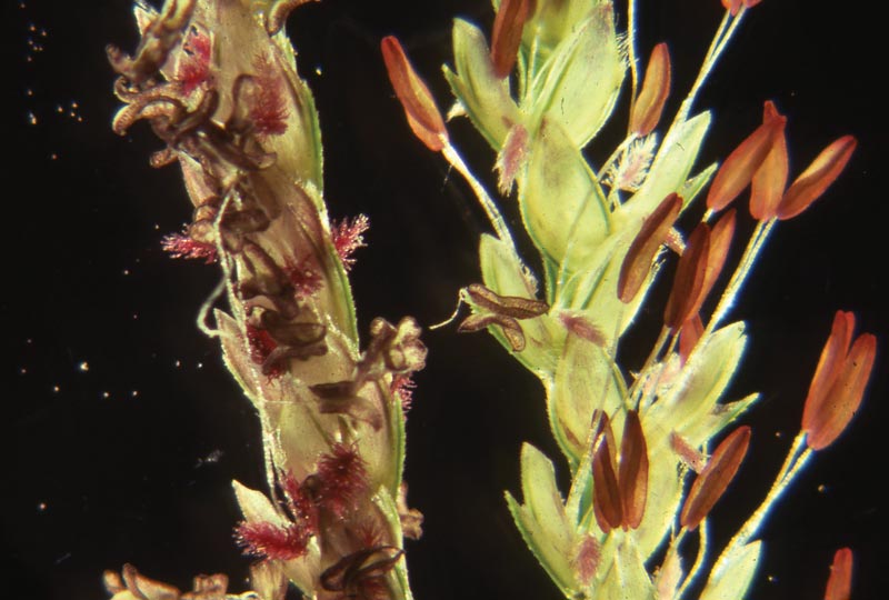 Figure 6. Anthers in flowers of bermudagrass. Anthers of common hybrid bermudagrass (left) dehisce (open to spread pollen), but the spongy anthers of triploid interspecific hybrid (right) remain closed and do not dehisce. Photo by Wayne Hanna
