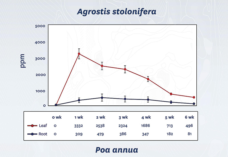 with 3,332 parts per million in creeping bentgrass and 4,395 ppm in annual bluegrass. Leaf accumulations of applied phosphite progressively declined and by six weeks had reduced to 14.9% and 19.6% of the maximum levels in creeping bentgrass and annual