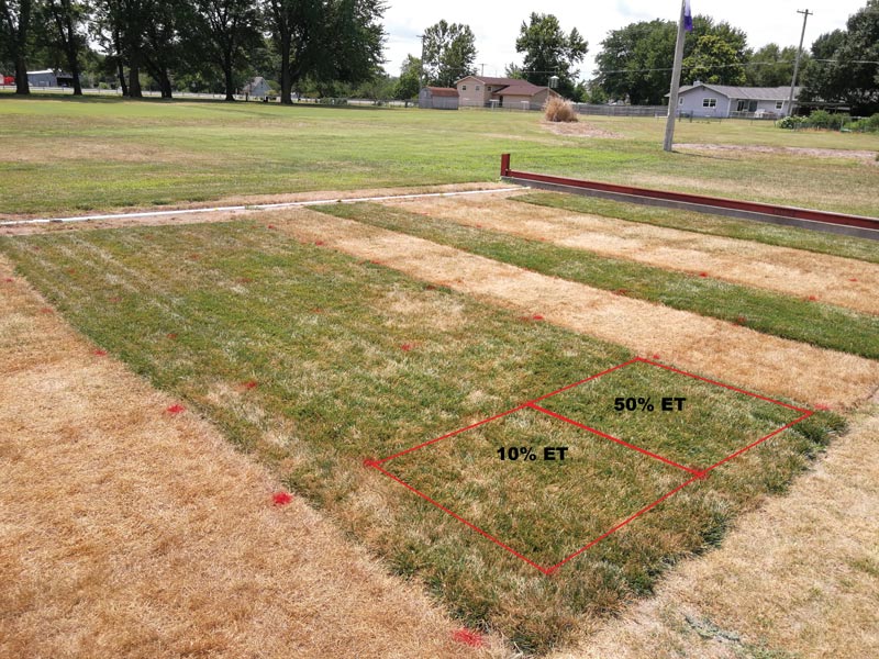 The authors want to acknowledge research advice from Steve Keeley, Ph.D., and the provision of turfgrass sod by The Sod Shop (Lawrence, Kan.), Helt’s Turf Farms (Pleasant Hill, Mo.) and Sod Topeka (Topeka, Kan.). The full manuscripts on the experiment are available in Crop Science for tall fescue and Kentucky bluegrass: “Minimum water requirements of cool-season turfgrasses for survival and recovery after prolonged drought” (https://doi.org/10.1002/csc2.20393); and for zoysiagrass: “Minimum water requirements of Japanese lawngrass for survival during prolonged drought” (https://doi.org/10.1002/csc2.20404).